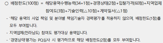 다.전라남도에 주된 영업소를 둔 지역업체와 공동수급체를 구성하여 참가하는 경우「지방자치단체 입찰시 낙찰자 결정기준」제2장의2 기술․학술연구 용역 적격심사 세부기준에 의거 지역업체 참여도에 따른 가점 적용