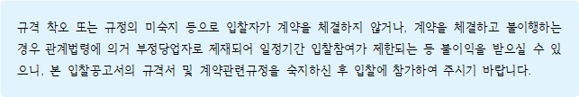 ※미자격자가 고의로 입찰에 참가하거나, 「지방계약법 시행령」 제92조 제2항의 각 호의 어느 하나에 해당한다고 판단될 경우에는 관계규정에 따라 부정당업자로 제재할 수 있습니다.