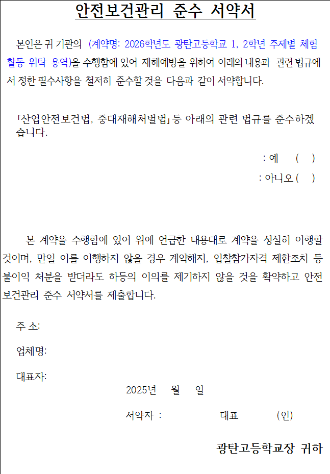 본인은 「2025학년도 광탄고등학교 1, 2학년 주제별 체험학습(제주도) 위탁용역」업무를 수행함에 있어 다음 사항을 준수할 것을 엄숙히 서약합니다.