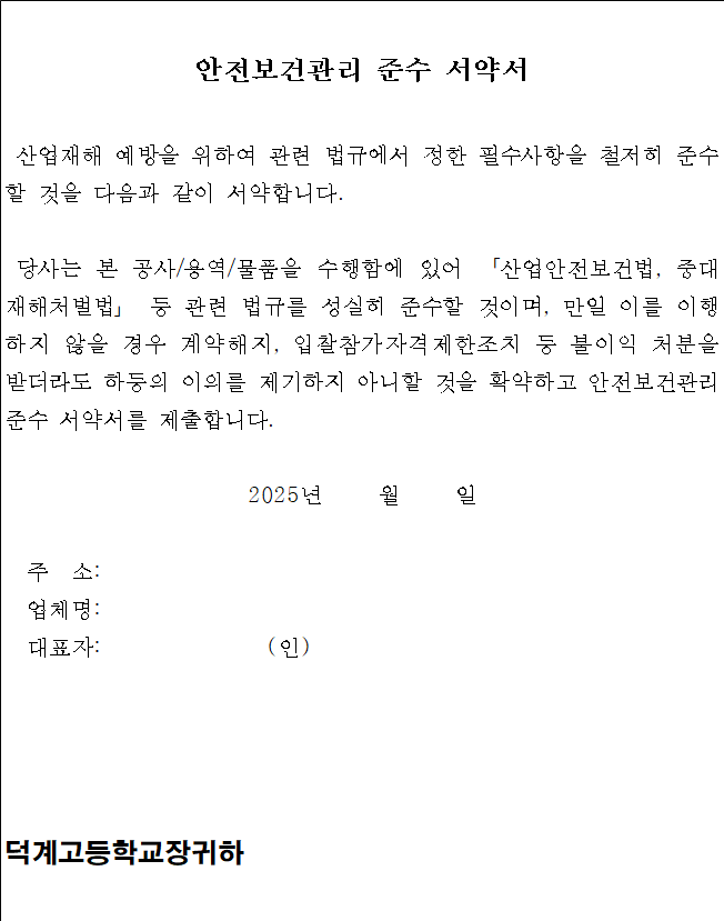 덕계고등학교의 업체 선정 및 계약 체결에 대하여 부정청탁을 하지 않을 것입니다. 또한 덕계고등학교의 “청렴계약이행을 위한 입찰 특별유의서와 청렴계약이행특수조건”을 반드시 준수