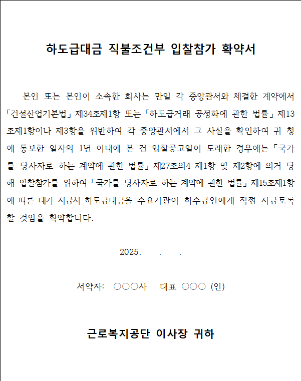 본 입찰에 참가하고자 하는 자는 근로자 권리보호를 위한 근로자 권리보호 서약서를 숙지하신 후 입찰에 응하여야 하며, 입찰서를 제출한 자는 근로자 권리보호 서약서를 제출한 것으로 간주합니다. 다만, 계약 체결시에는 낙찰업체의 대표자가 서명한 ‘근로자 권리보호 서약서’를 제출하여야 합니다.