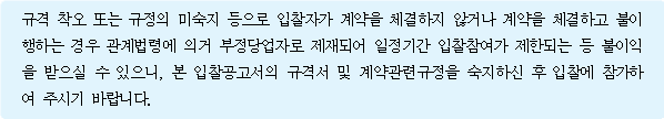 ※미자격자가 고의로 입찰에 참가하거나, 「지방계약법 시행령」 제92조 제2항의 각 호의 어느 하나에 해당한다고 판단될 경우에는 관계규정에 따라 부정당업자로 제재할 수 있습니다.