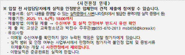 - 용역에 관한 사항: 교육청소년과 평생학습담당자 박진수(☎055-670-2613)