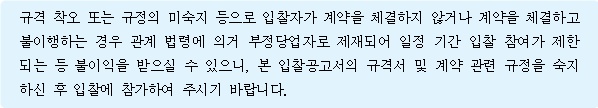 ※미자격자가 고의로 입찰에 참가하거나, 「지방계약법 시행령」 제92조 제2항의 각 호의 어느 하나에 해당한다고 판단될 경우에는 관계규정에 따라 부정당업자로 제재할 수 있습니다.