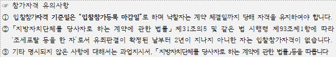 ⦁ 미자격자가 참가한 경우 또는 「지방자치단체를 당사자로 하는 계약에 관한 법률 시행령」 제92조에 해당한다고 판단될 경우에는 관계 규정에 의거 제재 받을 수 있습니다.