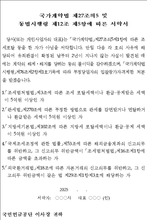 ○ 국가계약법 제27조의5 및 동법 시행령 제12조제5항에 따른 서약서(공모문 [붙임1])