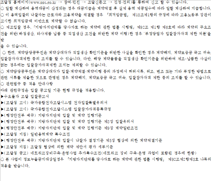 ※ 입찰마감일시 이전에 나라장터 온라인 평가시스템이 복구되는 경우, ‘온라인(서면) 평가’로 변경하여 진행될 수 있으며, 변경되는 경우 나라장터(입찰공고상세 → (상단)공지사항)에 공지합니다.