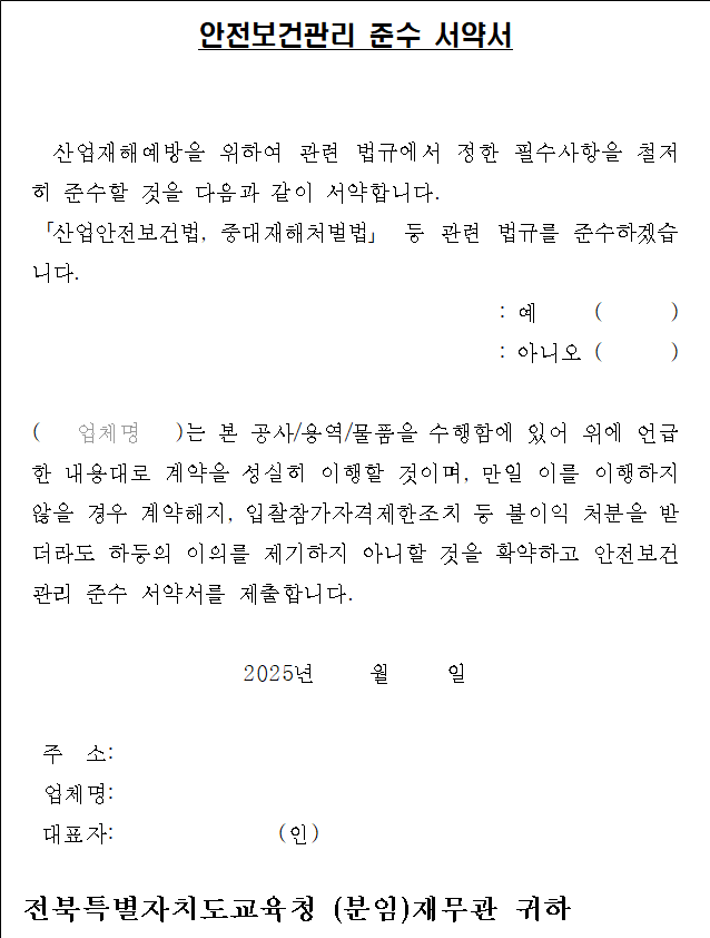 나. 입찰 참가자는 산업재해 예방을 위한 안전 및 보건에 관한 의무사항을 숙지하여 입찰서 제출에 응하여야 하며, 계약체결 시 [붙임] ‘안전보건관리 준수 서약서’를 제출하여야 합니다.