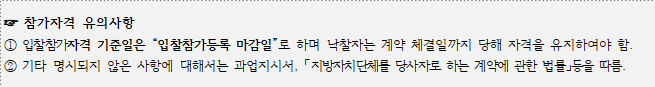 ⦁ 미자격자가 참가한 경우 또는 「지방자치단체를 당사자로 하는 계약에 관한 법률 시행령」 제92조에 해당한다고 판단될 경우에는 관계 규정에 의거 제재 받을 수 있습니다.