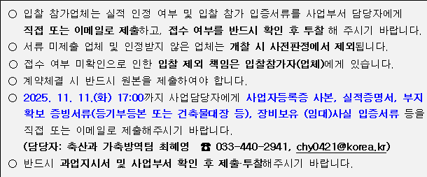 사. 개찰일시 및 장소: 2025. 11. 13.(목) 17:00 이후 / 화천군 입찰집행담당관 PC