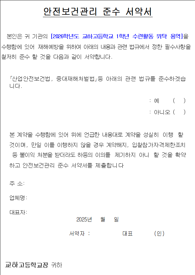 본인은 년 월 일부로 교하고등학교 1학년 수련활동 위탁용역 사업을 수행함에 있어 다음 사항을 준수할 것을 엄숙히 서약합니다.