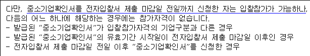 ※ 직접생산확인증명서 및 중소기업확인서는 전자입찰서 제출마감일 전일까지 발급된 것으로 유효기간 내에 있어야 하며, 중소기업 공공구매 종합정보망(www.smpp.go.kr)에서 확인하여 확인이 되지 않을 경우 입찰참가자격이 없습니다.