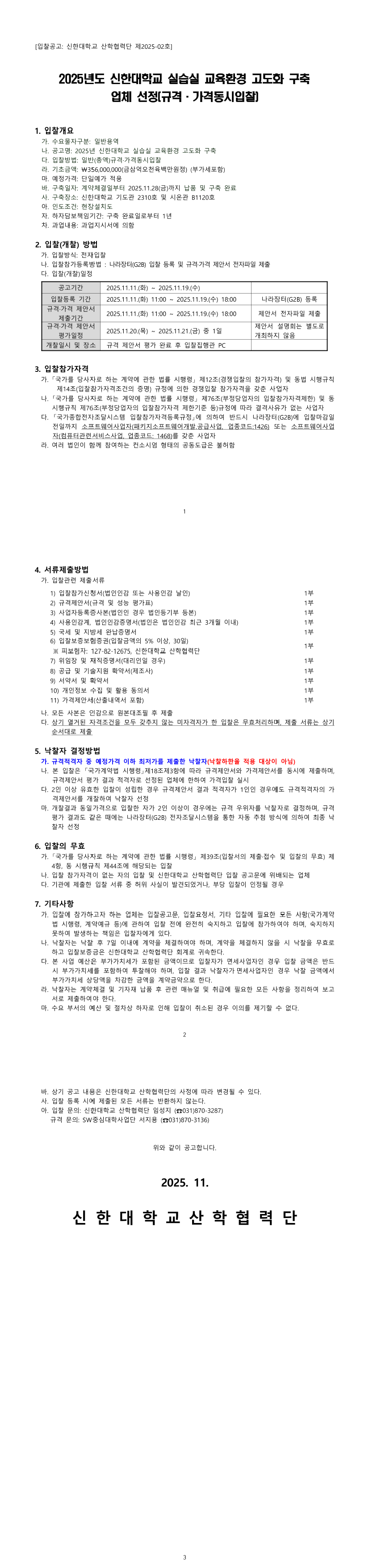 2025년도 신한대학교 실습실 교육환경 고도화 구축 업체 선정(규격·가격동시입찰) |