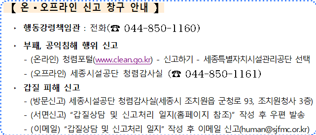 2. 종사자로부터 유해·위험요인에 대한 신고가 접수될 경우 보수·보강 등 개선 작업을 신속하게 조치하고, 세종특별자치시 및 관계행정기관의 이행 명령에 따른 개선사항을 성실히 이행하겠습니다.