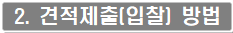 · 전자입찰의 견적서 제출은 조달청전자입찰 홈페이지의 전자입찰시스템을 이용하여야 하며 견적서 제출의 확인은 전자입찰시스템 보낸 문서함을 이용하시기 바랍니다.