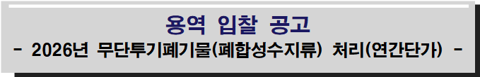 『2026년 무단투기폐기물(폐합성수지류) 처리(연간단가)』 계약을 위하여「지방자치단체를 당사자로 하는 계약에 관한 법률」 제10조 및 같은 법 시행령 제33조, 지방자치단체 입찰 및 계약집행기준의 규정에 따라 아래와 같이 입찰 공고합니다.