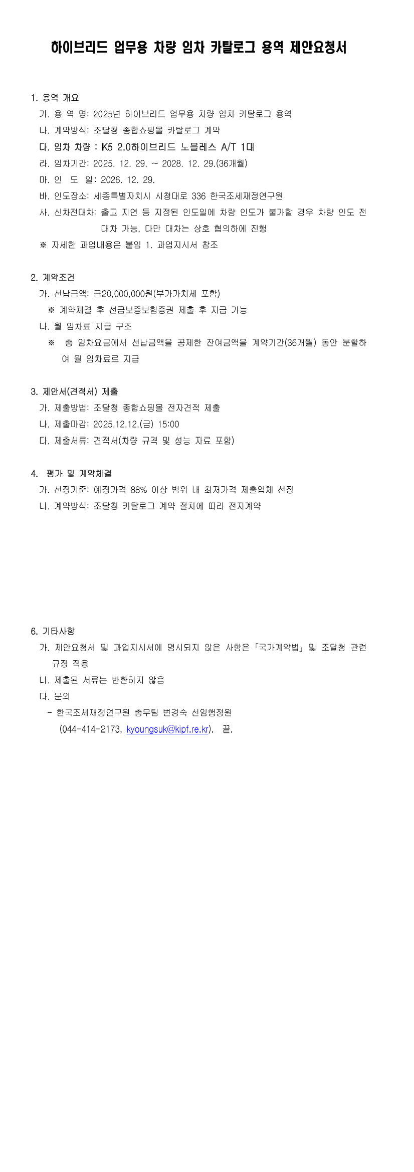 하이브리드 업무용 차량 임차 카탈로그 용역 |
