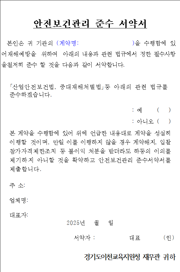 ○ 본 입찰에 참가하고자 하는 자는 중대재해 예방을 위한 「안전보건관리 준수 서약서」[붙임2]를 숙지한 후 입찰에 응하여야 하며, 입찰서를 제출한 자는 「안전보건관리 준수 서약서」를 제출한 것으로 간주합니다. 다만 계약 체결 시에는 낙찰업체의 대표자가 서명한 서약서를 제출해야 합니다.