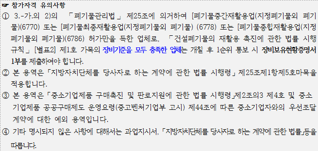 2) 「폐기물관리법」제25조에 의거하여 국가종합전자조달시스템에 [폐기물중간재활용업(지정폐기물외 폐기물)(6770) 또는 [폐기물최종재활용업(지정폐기물외 폐기물) (6778) 또는 [폐기물종합재활용업(지정폐기물외 폐기물)(6786)의 업종을 모두 등록하고 관련 법에 따른 허가를 득한 업체.