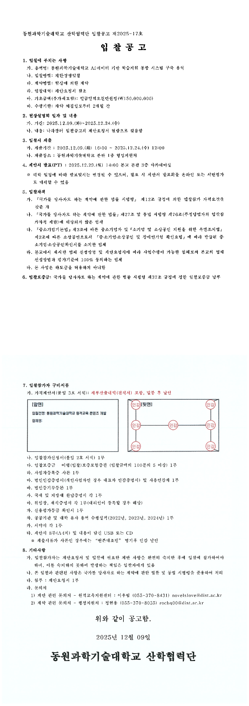 동원과학기술대학교 AI?데이터 기반 학습지원 통합 시스템 구축 용역 |