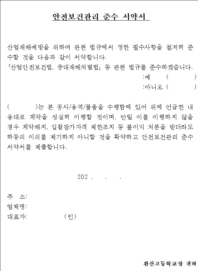 나. 본 입찰(견적)에 참가하고자하는 자는 중대재해 예방을 위한 안전 및 보건 확보 의무사항을 숙지하신 후 입찰(견적)에 응하여야 하며, 계약 체결 시에 【붙임1】「안전보건관리 준수 서약서」,【붙임2】「안전·보건관리계획서」를 제출하여야 합니다.