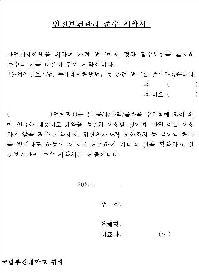 나. 입찰에 참여하는 자는 중대재해 예방을 위한 「안전보건관리 준수 서약서」를 숙지하신 후 입찰에 응하여야 하며, 입찰서를 제출한 자는 「안전보건관리 준수 서약서【붙임1】」를 제출한 것으로 간주합니다. 다만 계약 체결 시에는 낙찰업체의 대표자가 서명한 서약서를 제출해야 합니다.