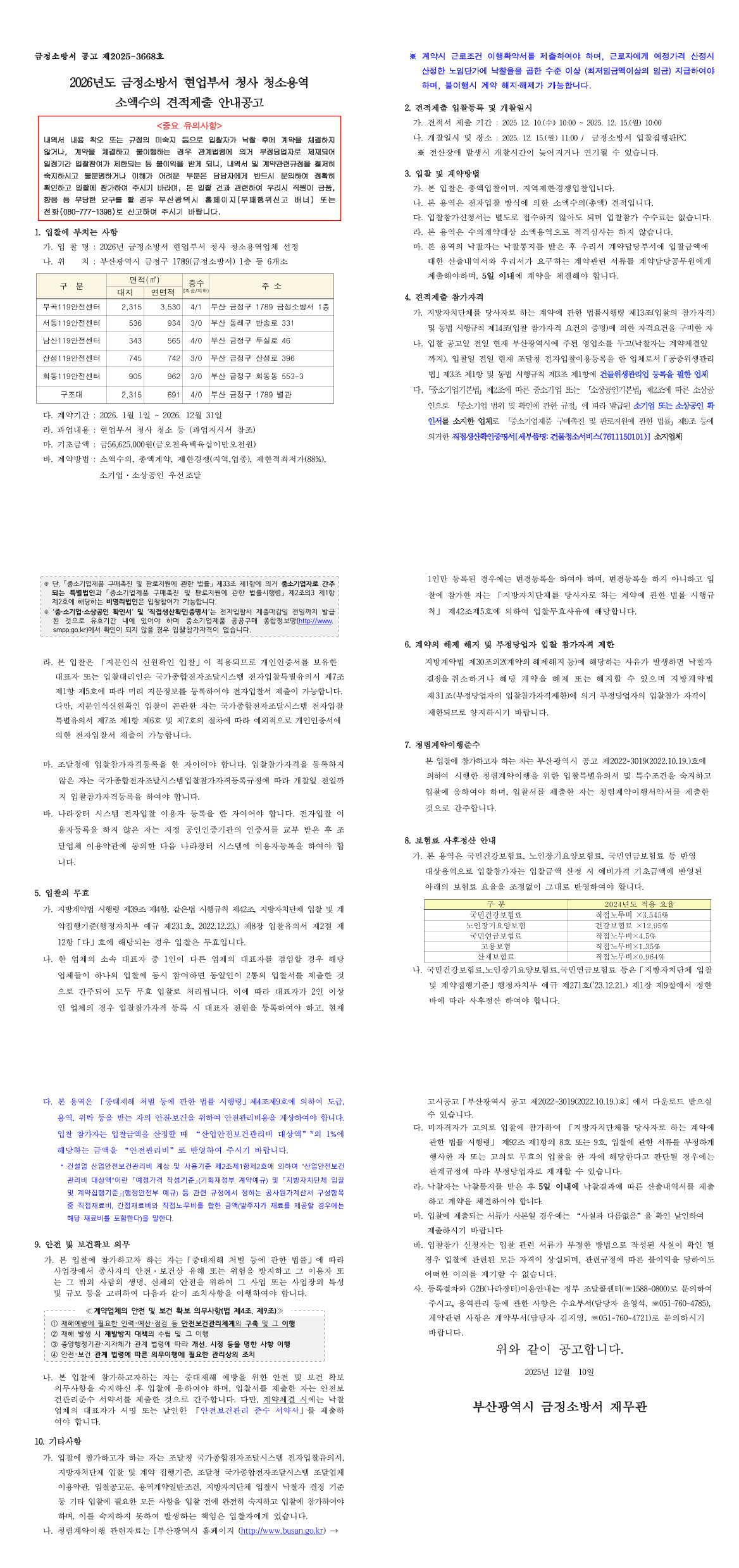 소액수의 견적제출 안내 공고(2026년도 금정소방서 현업부서 청사 청소 용역업체 선정) |