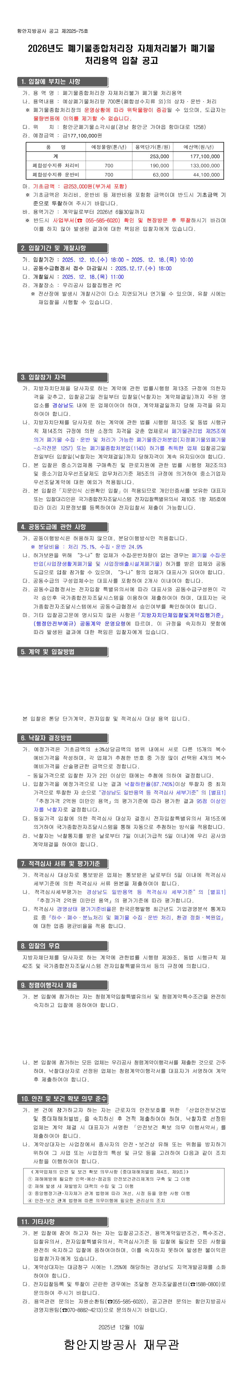 2026년도 폐기물종합처리장 자체처리불가 폐기물 처리용역 |