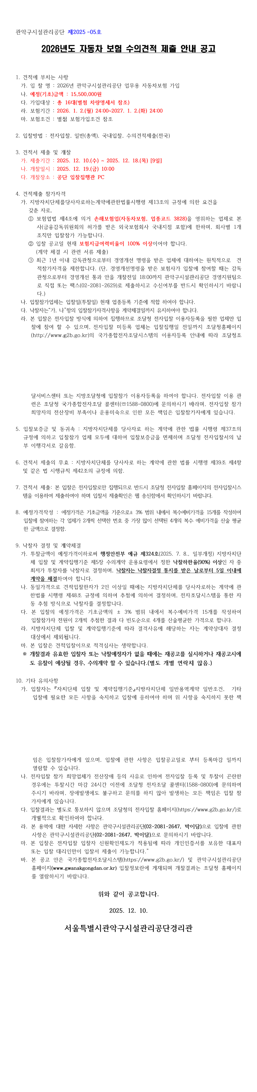 2026년 관악구시설관리공단 업무용 자동차보험 가입공고 |