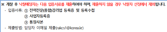 ○ 입찰 참가자는 입찰서 제출 마감일(적격심사 대상자는 적격심사서류 제출일, 낙찰자는 계약 체결일)까지 해당 입찰 참가자격을 계속 유지하여야 합니다.
