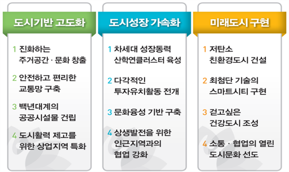 라. 행복도시는 미래적 가치를 담은 세계적인 명품도시 건설을 목표로, 도시기반 고도화, 도시성장 가속화, 미래도시 구현의 이념을 갖고 건설 추진 중