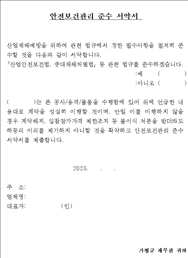 나. 본 입찰에 참가하고자하는 자는 중대채해 예방을 위한 안전 및 보건 확보 의무사항을 숙지하신 후 입찰에 응하여야 하며, 계약 체결 시에 【붙임】「안전보건관리 준수 서약서」를 제출하여야 합니다.