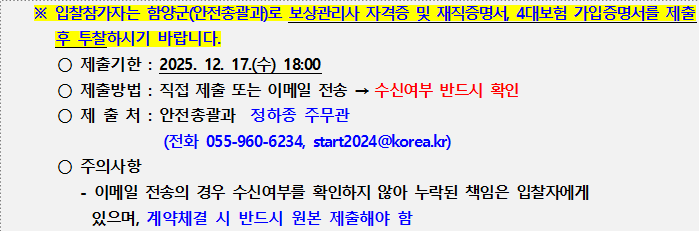 ○ 과업에 관한 문의사항 : 함양군 안전총괄과 정하종(☏ 055-960-6234)