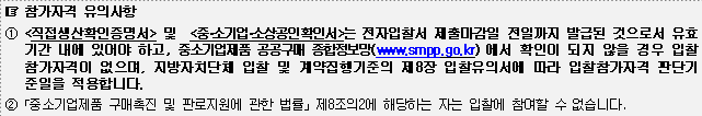 ※ 본 입찰에 미 자격자가 고의로 입찰에 참가할 때에는 「지방계약법 시행령」 제92조에 의거 관련법규에 따라 부정당업자로 제재할 수 있습니다. 입찰대리인은 반드시 입찰참가업체의 임ㆍ직원이어야 하며, 같은법 시행규칙 제42조 제5호에 따른 변경등록을 하지 않은 입찰자의 입찰은 무효입니다.