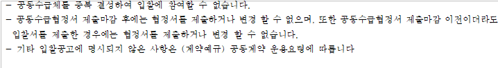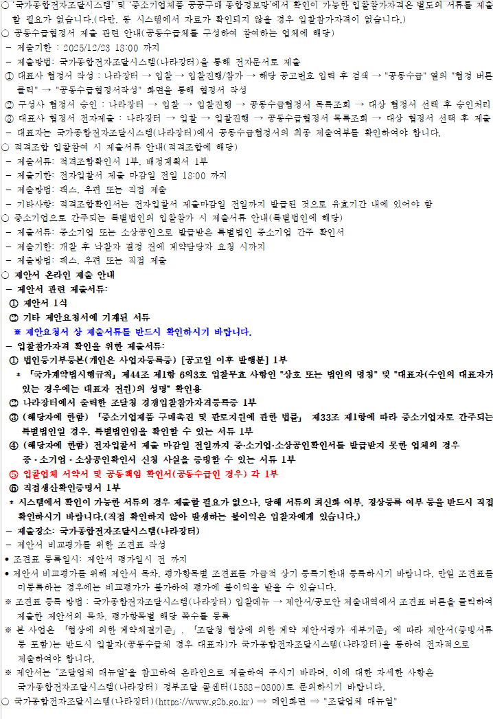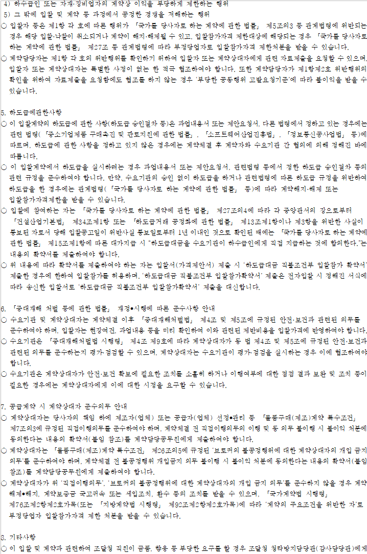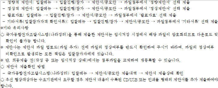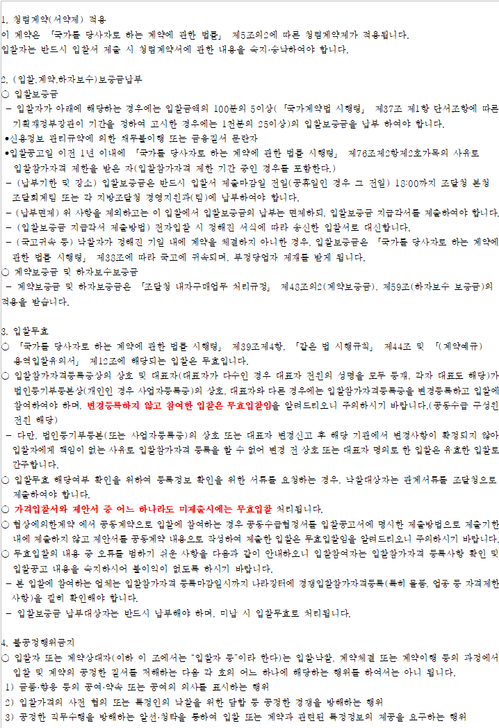 - 제출된 서류(제안서 포함)가 부정 또는 허위로 작성된 것으로 판명된 때에는 협상대상자 및 낙찰자 결정에서 제외됩니다.
