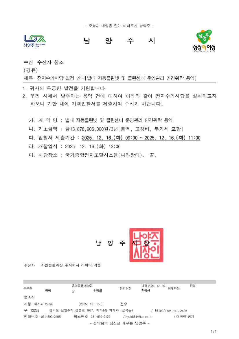 별내 자동클린넷 및 클린센터 운영관리 민간위탁 용역 |