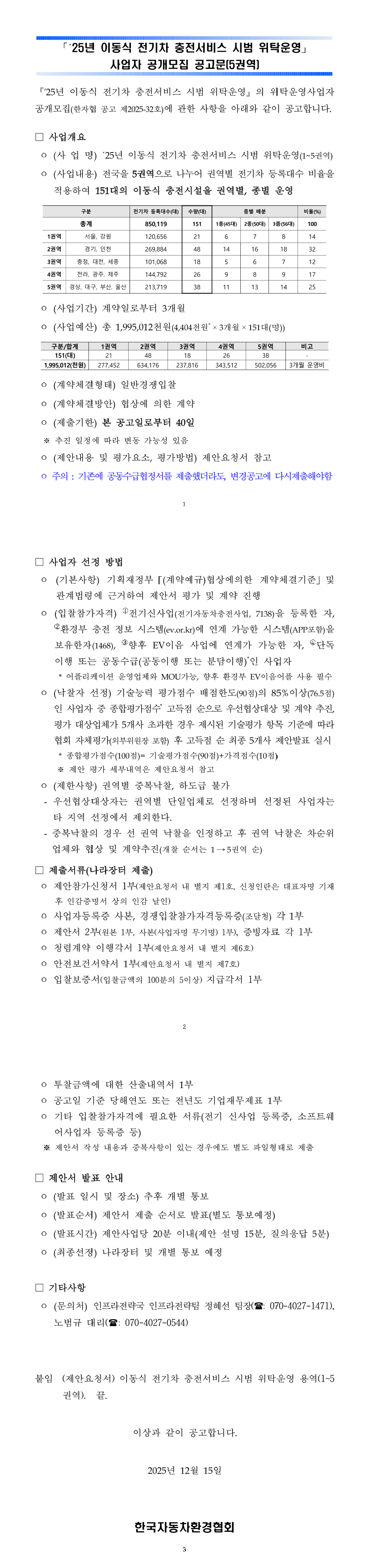 ′25년 이동식 전기차 충전서비스 시범 위탁운영」 사업자 공개모집(5권역) |