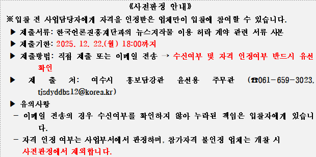 - 용역에 관한 사항 : 여수시 홍보담당관 윤선용(☎061-659-3023)
