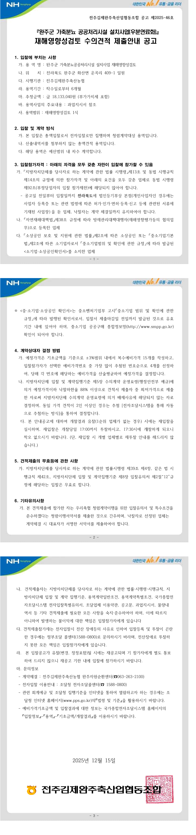 완주군 가축분뇨 공공처리시설 설치사업 재해영향성검토 수의견적 제출안내 공고 |