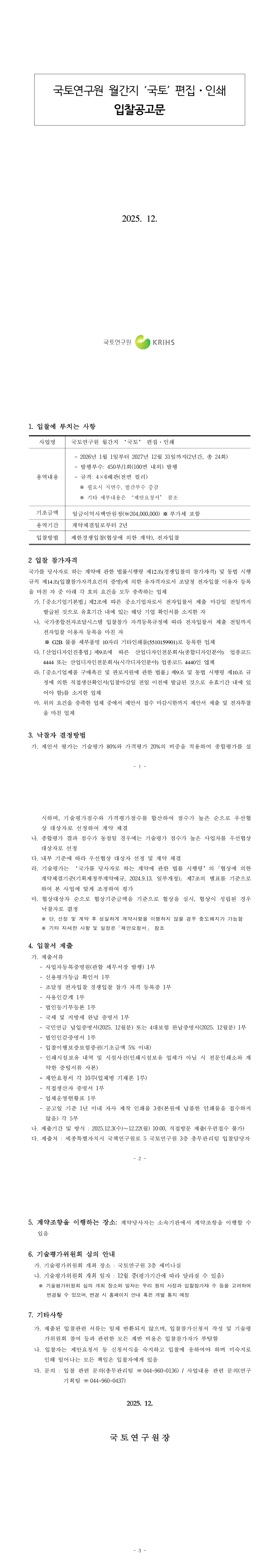 국토연구원 월간지 「국토」 편집·인쇄업체 선정 |