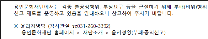 ◈ 본 사업은 「지방자치단체를 당사자로 하는 계약에 관한 법률」 제23조의 규정에 의한 회계연도 시작 전 또는 예산 확정 전의 계약으로 용인시 지방의회의 예산심의 및 (재)용인문화재단 이사회 심의결과에 따라 공고취소 및 변경, 계약금액 변경, 낙찰 취소가 될 수 있으며, 최종 낙찰자와의 계약 시 확정된 예산의 범위 내에서 변경될 수 있습니다.