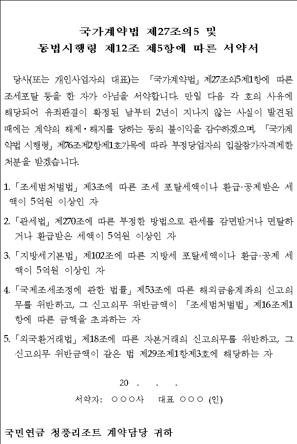 우리 청풍리조트는 “청풍리조트 세탁물 처리 용역” 계약 체결 및 집행과 관련하여 「(계약예규) 정부 입찰·계약 집행기준」제98조의4에 따라 아래 각 호의 사항을 준수할 것을 서약합니다.