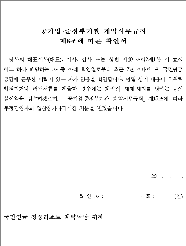 당사는 부패 없는 투명한 기업경영과 공정한 행정이 사회발전과 국가 경쟁력에 중요한 관건이 됨을 깊이 인식하고, 국민연금 청풍리조트가 실시하는 청렴계약제 시행 취지에 적극 동참하여 귀 국민연금 청풍리조트가 발주하는 “청풍리조트 세탁물 처리 용역” 계약의 입찰에 참여할 때 당사 및 하도급업체의 임직원과 대리인은