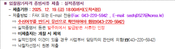 - 용역에 대한 상세내용은 발주부서의 담당자(043-220-5942)에게 문의하시고