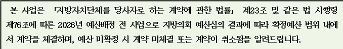 ※ 용역기간 12개월(2026. 1. 1. ~ 2026. 12. 31.)로 산정하여 투찰하시기 바라며, 지방의회 예산심의 일정에 따라 계약체결이 지연될 경우 용역기간 변경으로 실제 용역 착수일부터 정산하여 지급합니다.