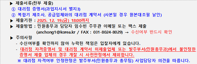 - 용역관련 사항은 민원총무과 총무팀 (☎ 031-8024-8033), 계약관련 사항은 민원총무과 관리팀 (☎ 031-8024-8042)으로 문의 바랍니다.