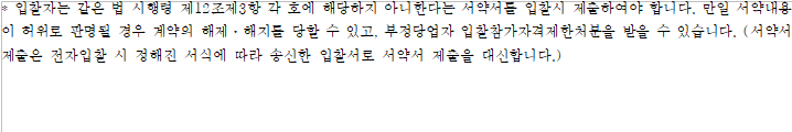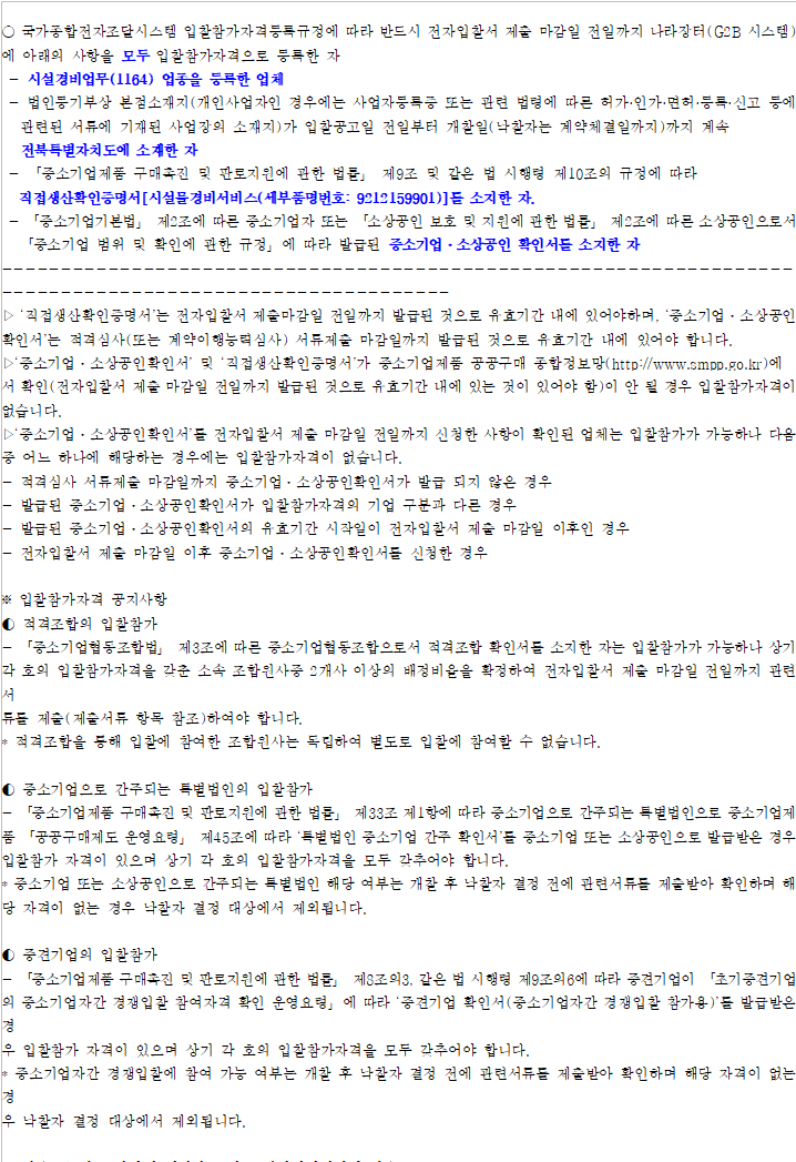 - 이 입찰은 국가를 당사자로 하는 계약에 관한 법률 제10조제2항제1호 및 같은 법 시행령 제42조에 따라 계약이행능력심사