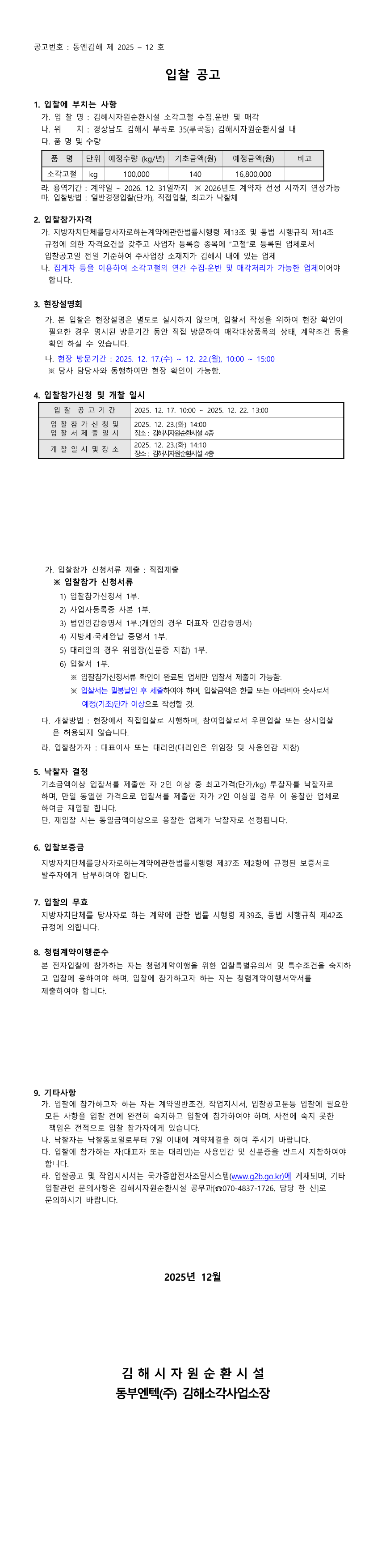 김해시자원순환시설 소각고철 수집운반 및 매각 |