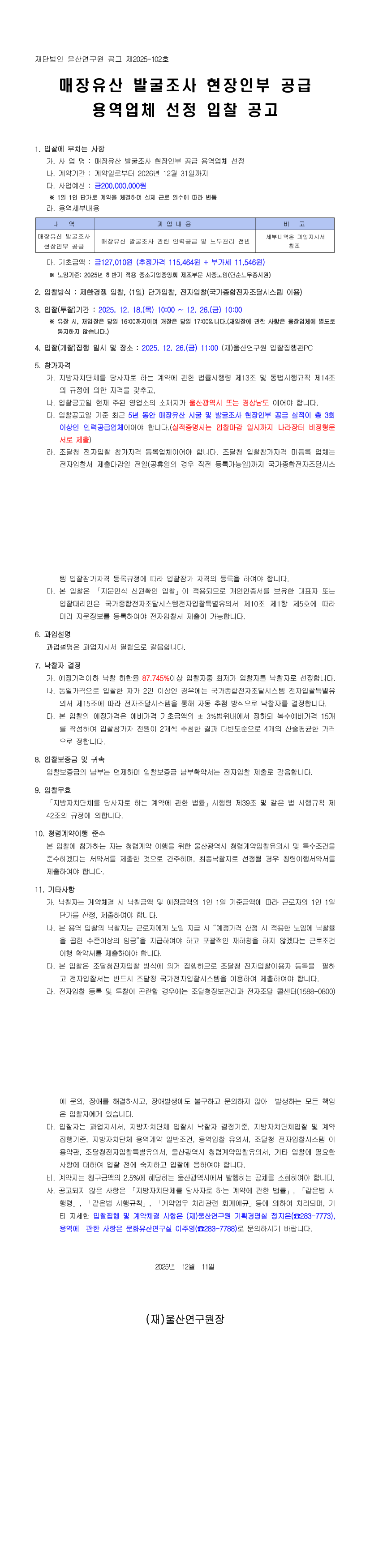 매장유산 발굴조사 현장인부 공급 용역업체 선정 |