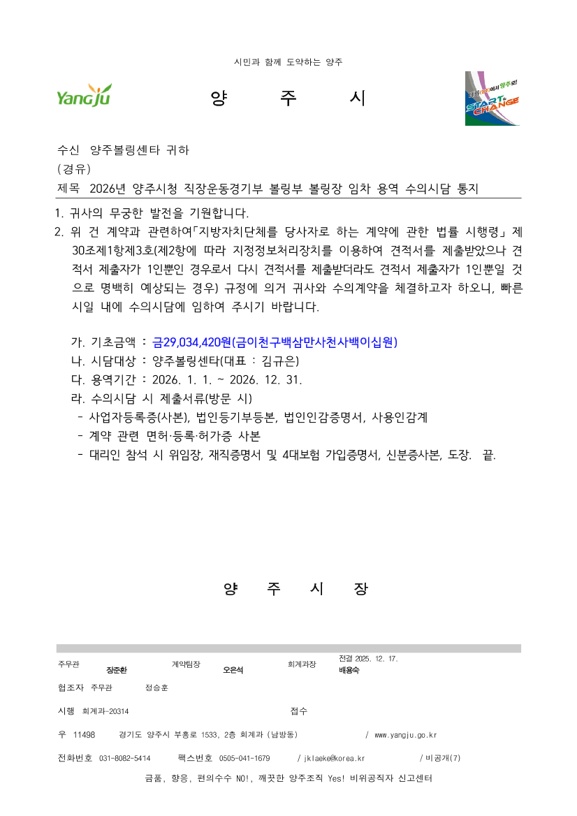 2026년 양주시청 직장운동경기부 볼링부 볼링장 임차 용역 |